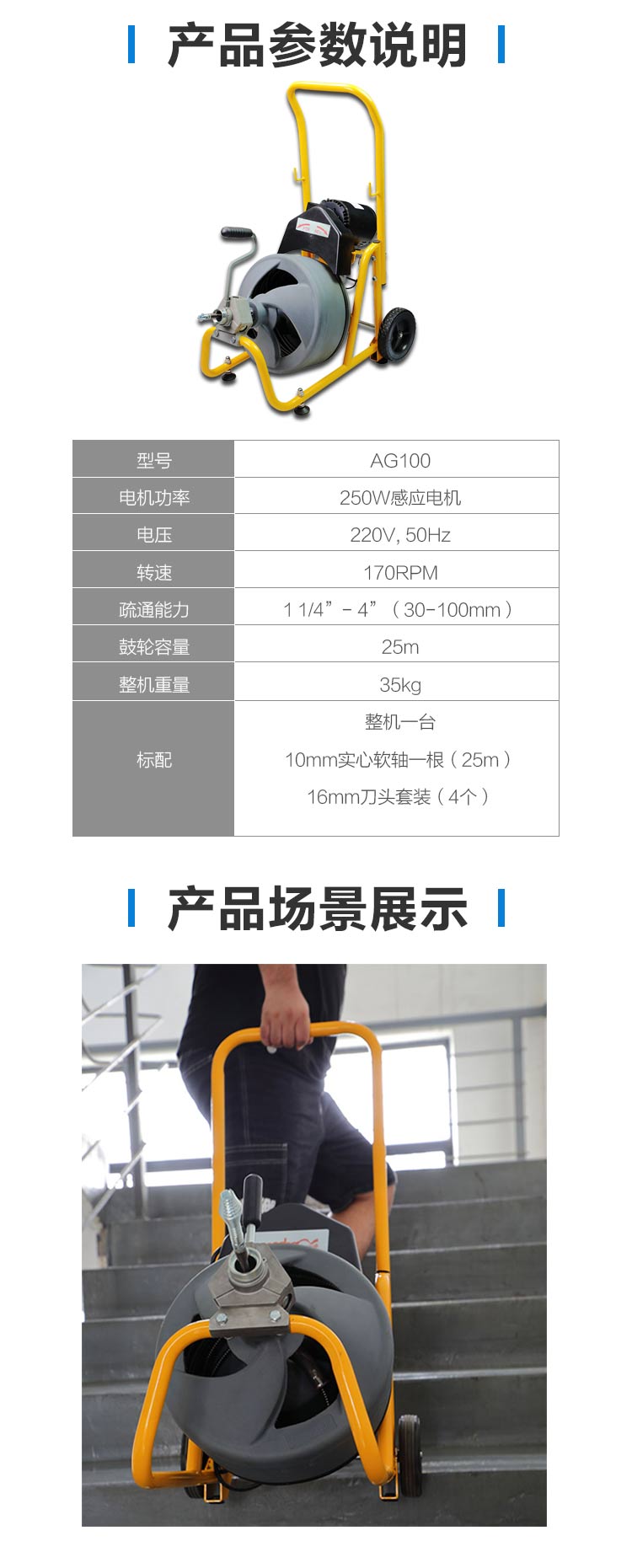 虎王AG100高效鼓式疏通機(jī)下水管道疏通神器家用堵塞清理工具